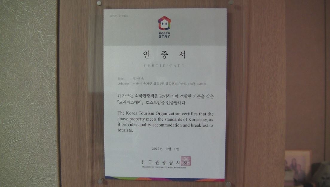 ◇서울시 송파구 잠실동에 위치한 그녀의 집 한쪽 벽면에 한국관광공사의 홈스테이 인증 브랜드 코리아스테이(Korea Stay) 인증서가 걸려 있다.(사진촬영=서지명 기자)