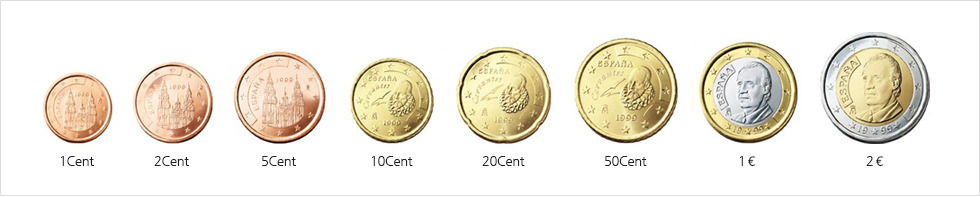 스페인의 경우 1,2,5Cent의 경우에는 산띠아고 데 꼼뽀스뗄라의 대성당이 새겨져 있으며 10,20,50Cent 동전에는 돈키호테를 창조해낸 스페인의 위대한 작가 세르반테스의 얼굴이 새겨져 있고, 1,2€ 동전에는 스페인의 현재 국왕인 후안 카를로스 1세 (Juan Carlos I)의 얼굴이 새겨져 있습니다.