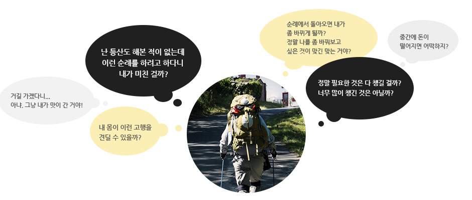 순례를 계획하면서 느끼게 되는 알 수 없는 불안과 공포는 자연스러운 것입니다. 불안을 떨쳐버리고 자신의 순례를 믿으며 마음의 준비를 하는 것이 좋습니다.
