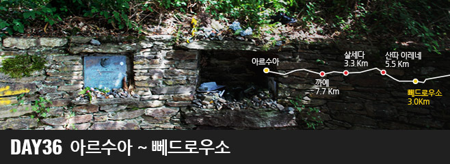 아르수아에서 뻬드로우소에 이르는 여정은 총 20킬로미터로 게으름을 피워도 쉽게 걸을 수 있는 구간입니다. 아르수아에서 출발하는 순례자들은 급한 마음에 N-547 도로를 따라 걷기도 하지만 이 여정은 자동차 전용도로보다 더 짧고, 부드러운 산길이 아름답습니다. 살세다를 지나면서 까미노는 뻬드로우소에 도착하기까지 자주 N-547 도로와 마주치게 되므로 항상 교통 상황에 조심하는 것을 잊지 맙시다.
