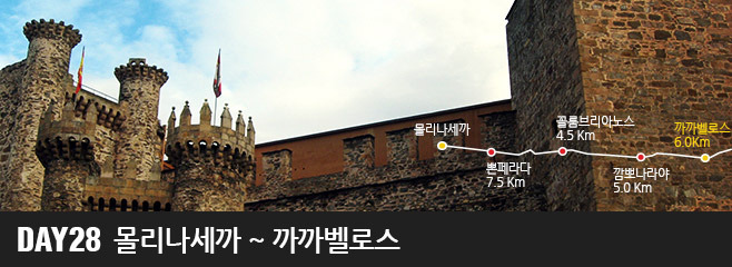 몰리나세까에서 까까벨로스에 이르는 스물여덟 번째의 여정은 약 24킬로미터로 평탄한 길이 이어집니다. 이 여정의 핵심은 템플 기사단의 도시인 뽄페라다 입니다. 이곳은 마치 황금빛 갑옷을 입은 기사가 백마를 타고 나올 것 같은 템플 기사단의 성이 인상적인 장소입니다. 이 구간은 엘 비에르소의 가운데를 관통하는 긴 내리막길이 이어지는 길입니다. 또한 온화한 기후와 풍성한 인심, 산으로 둘러싸인 축복받은 땅이 있기도 합니다. 뽄페라다에서부터는 마을의 규모가 상당히 커지고, 그만큼 순례자를 위한 충분한 서비스가 준비되어있습니다. 뽄페라다에서 나오는 길은 꼼뽀스띠야라고 부르는 공장지역을 통과하기 때문에 볼품없지만 곧 아름다운 과수원 지역을 지나게 됩니다. 이곳에서 생산되는 포도로 만들어진 포도주는 향기롭고, 봄에는 벚꽃이 만발하고, 가을에는 붉은 포도와 고소한 견과류가 많이 재배됩니다. 특히 스물여덟 번째 여정의 목적지인 까까벨로스의 쁘라다 아 또베는 까미노 프란세스에서 가장 아름다운 포도 농장 중 하나입니다.