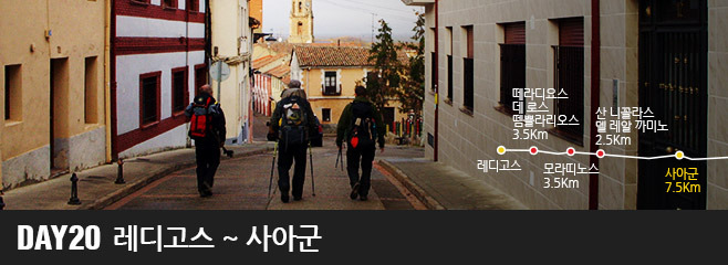 레디고스에서 사아군에 이르는 스무 번째 여정은 빨렌시아의 마지막 까미노이며 레온의 첫 까미노를 걷게 되는 루트입니다. 약 17킬로미터 정도로 짧은 구간인 이유는 아름다운 사아군의 건축물들을 충분히 감상하는 시간을 갖고, 며칠 동안 걸어야 할 메세타 지역의 피곤함을 대비해 충분한 체력을 비축하기 위해서 입니다.