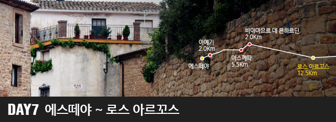 외롭게 홀로 떨어져있는 마을인 비야마요르 데 몬하르딘에서 일곱 번째 여정의 목적지인 로스 아르꼬스까지는 12킬로미터가 넘습니다. 이 구간에서 순례자는 어떤 마을도 만날 수 없음으로 충분한 행동식과 훨씬 많은 물을 미리 준비하여야 하며 일사병이 우려되는 씨에스타 시간을 피하는 것이 현명합니다.