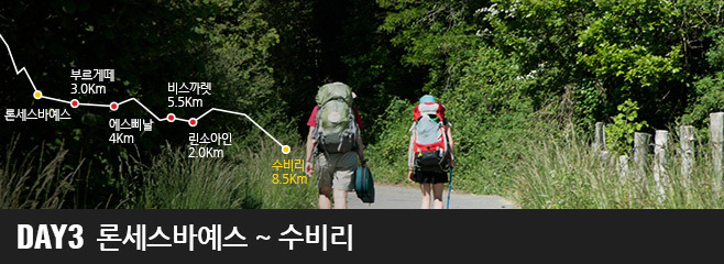 론세스바예스에 도착한 대부분의 순례자들은 잠들기 전 순례자를 위한 미사에 참가하게 됩니다. 미사를 통하여 사제는 순례자의 안전과 평화를 기원하며 미사가 끝난 이후에는 모든 순례자들의 손을 잡아주며 축복을 건넵니다. 새벽이 밝아오면 순례자들은 다시 아름다운 길을 떠나게 됩니다. 이 길은 피레네 산맥의 정상에서 가까운 곳으로부터 저 아래에서 순례자를 기다리고 있는 부드러운 평원의 단조로움과 고독감을 느끼게 해주는 코스입니다. 길옆의 나무에서는 잎들이 무성하게 자라나서 마치 거대한 그림자 터널에 갇혀있는 듯한 느낌마저 주며 이러한 풍경은 고산지대 목장의 좁은 길을 따라서 수비리를 향해 내려가는 동안 계속 이어집니다. 아르가 강을 향해 내려가는 이 길에는 중간에 메스키리츠 고개와 에로 고개를 넘어야 하지만 피레네 산맥을 걸어서 넘은 순례자에게는 그렇게 부담스러운 길이 아닙니다.